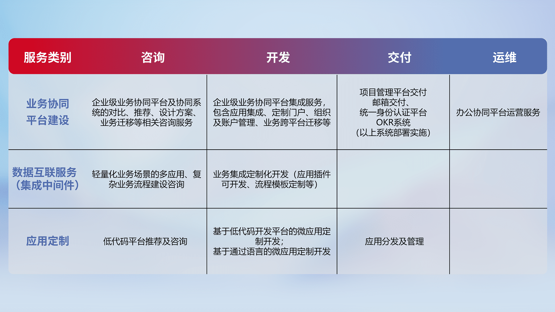 针对钉钉、、、企微、、、、IDaas等平台级产品提供产品的规划、、方案、、、交付、、、、定制化开发等服务,,实现如统一协同办公、、智能客户服务、、、混合会议管理、、、智能数据查询、、、、等业务场景,,,实现数字化转型。。。。